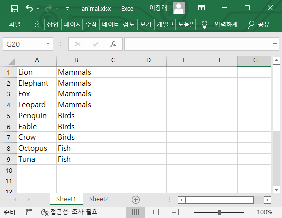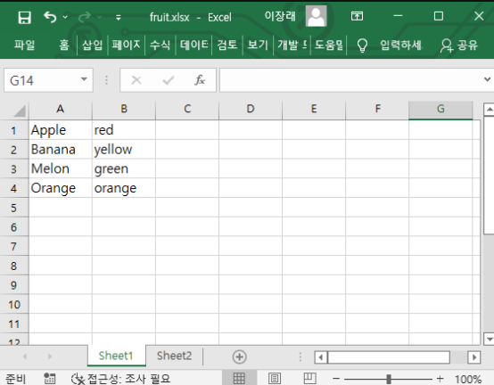 2. 엑셀 파일 읽기 - 기존 들고 있던 Fruit.xlsx 파일 사용