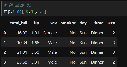 tip.iloc[0:4,:]를 하게 되면 위 데이터 프레임에서 보이는 0~3까지만 출력하게 된다는 것이다.