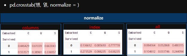 normalize = 'columns' / 'index' 로 열 기준으로 할 것인지, 행 기준으로 할 것인지 정할 수 있다.