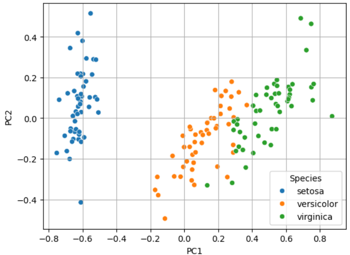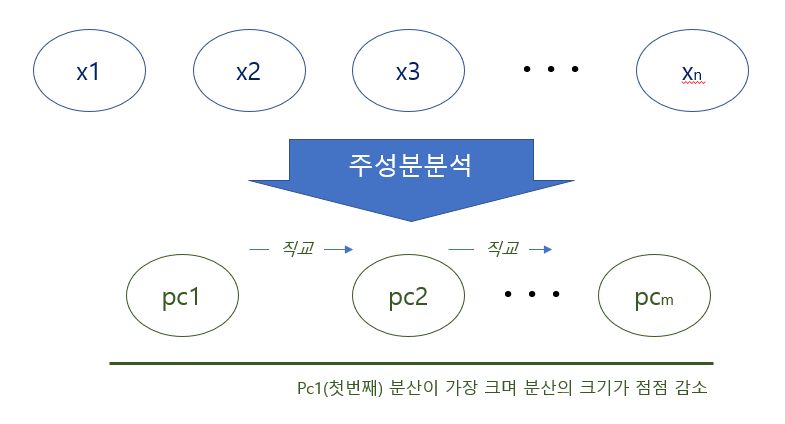 - PC1: 데이터의 변동성 중 가장 큰 부분을 설명하는 1차원 축.