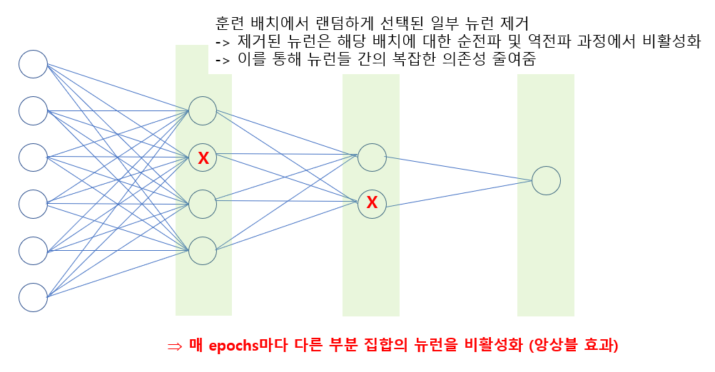 - 훈련 과정에서 신경망의 일부 뉴런을 임의로 비활성화 시킴으로써 모델을 강제로 일반화