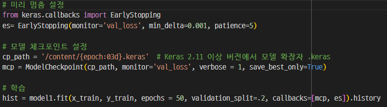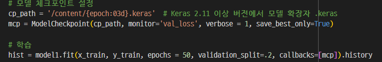 hist = model.fit(x_train, y_train, epochs=50, validation_split=.2, callback=[mcp]).history