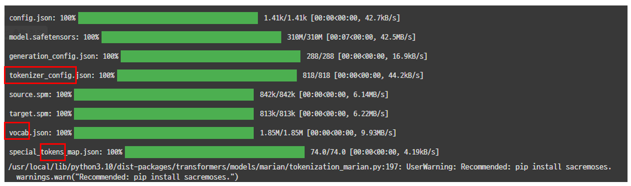 => 이렇게 tokenizer, vocab과 같은 단어들이 설치 되는 것을 확인할 수 있다.