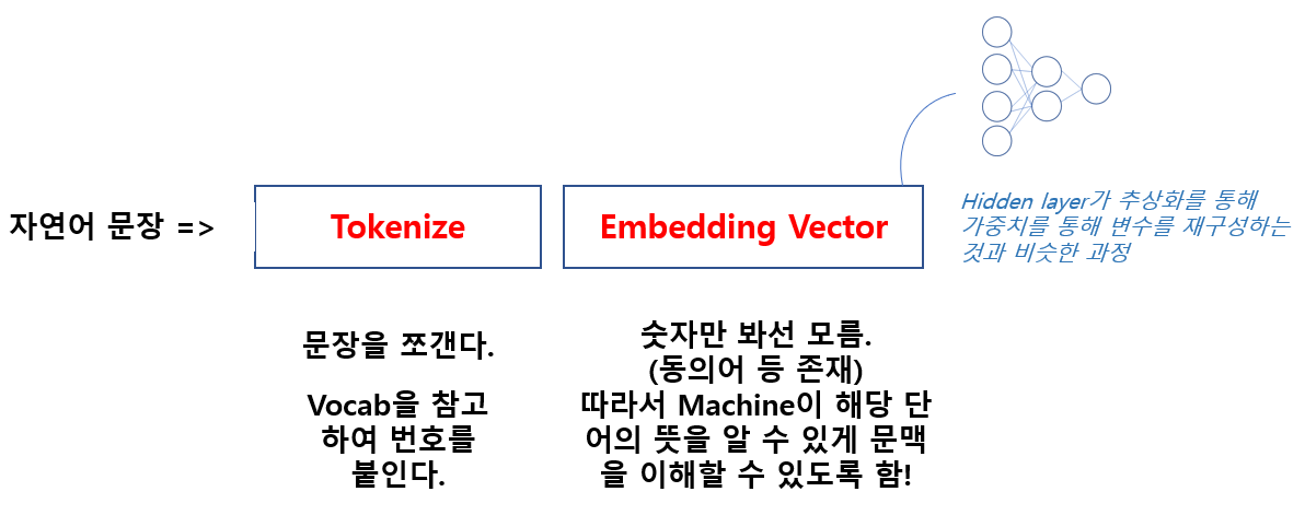 | 쪼개고 (보통 형태소 기반) => 숫자로 변형 (vocab_자연어와 컴퓨터언어 사전이라고 생각하면 됨) |