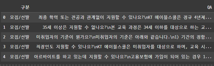 data = pd.read_csv(path + 'aivleschool_qa.csv', encoding='UTF-8')