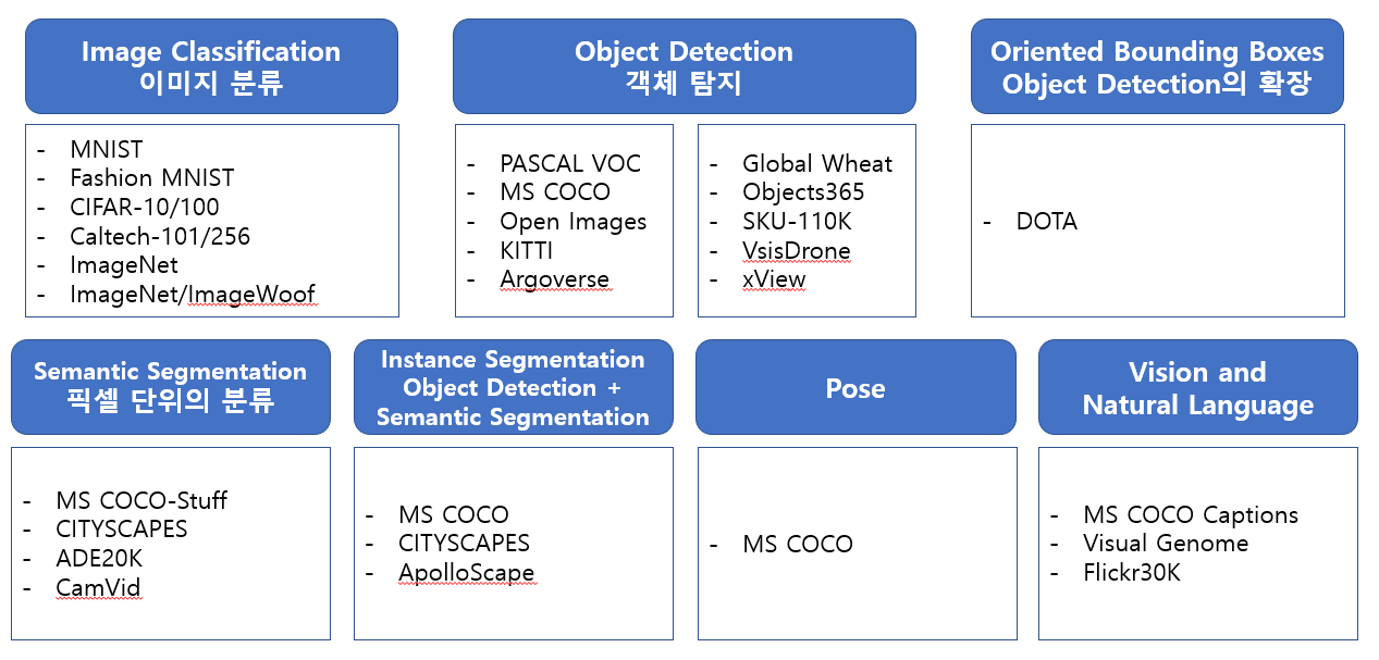 Computer Vision Task와 Datasets는 아래와 같다.