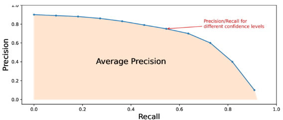 | Precision - Recall Curve : 모델의 "평가 과정"에서 그려진다. 그래프 아래의 면적이 클수록 정확하게 예측하고 놓친 객체가 적다는 뜻 |