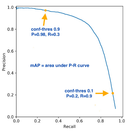 3. Confidence score 임계값이 다양하게 변화하면서 Precision, Recall이 계산되어 P-R curve가 그려짐
