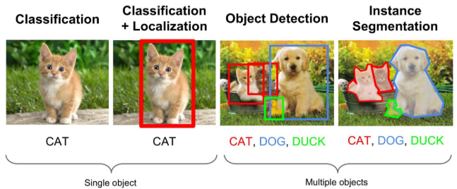 - Classification + Localization : 단 하나의 Object 분류 + 어디있는지 위치를 표시 (Bounding Box)